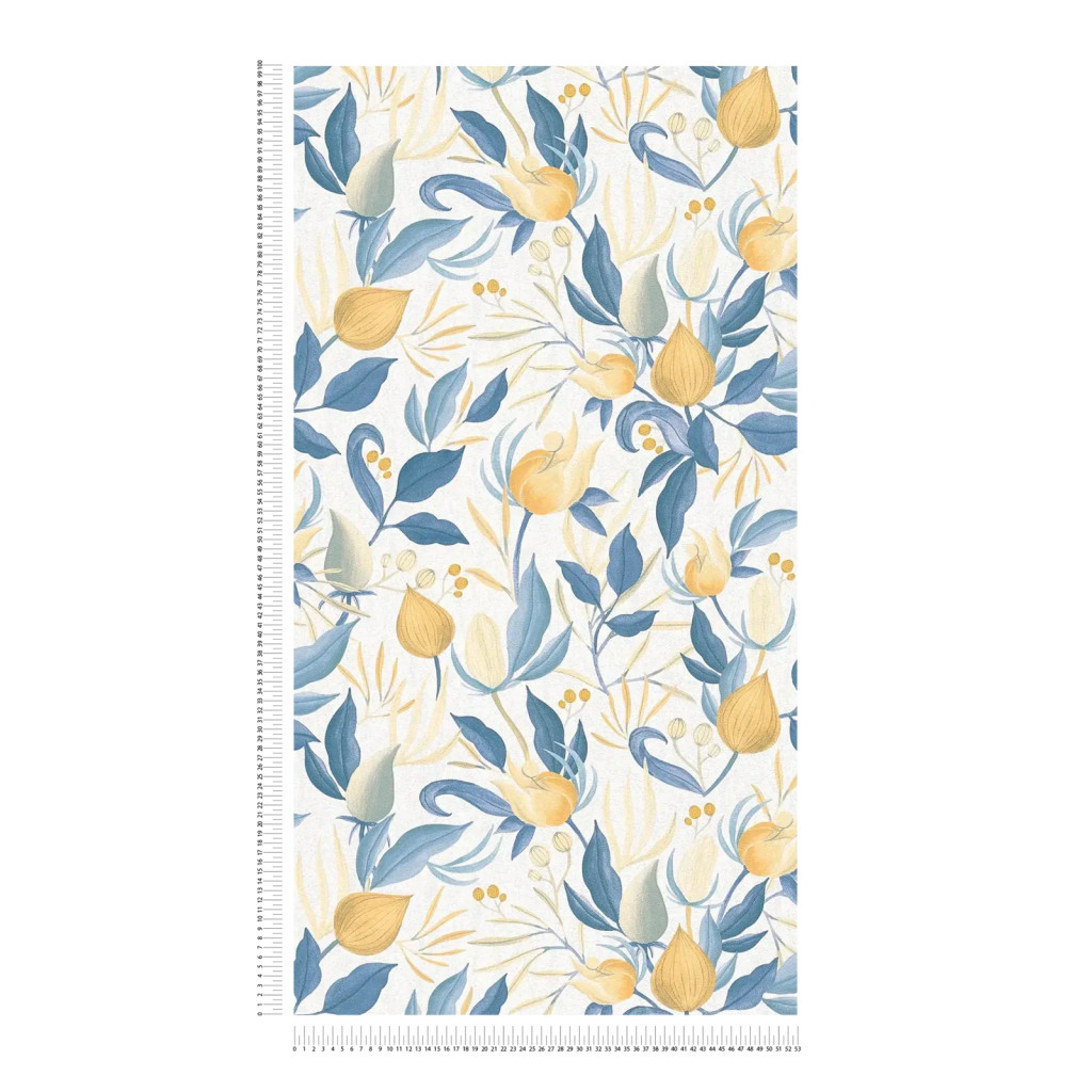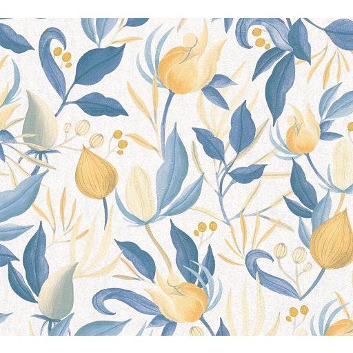Tipp : Fehér alapon úszó mézes sárga és vajszínű tulipánok mellett denim kék