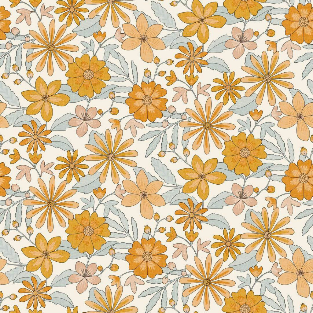 és barack árnyalatú virágok vidáman incselkednek a pasztellkék levelekkel meleg