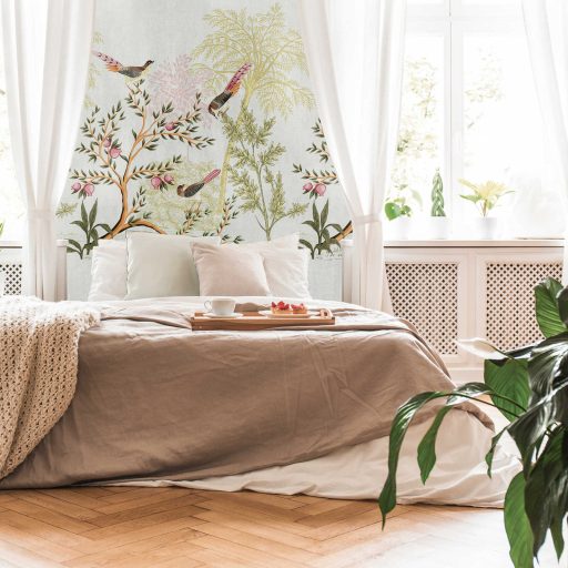 A nektár hívogató illata - kies botanikai csendélet szines madarakkal szürke zöld sárga és sokszínű tónus falpanel