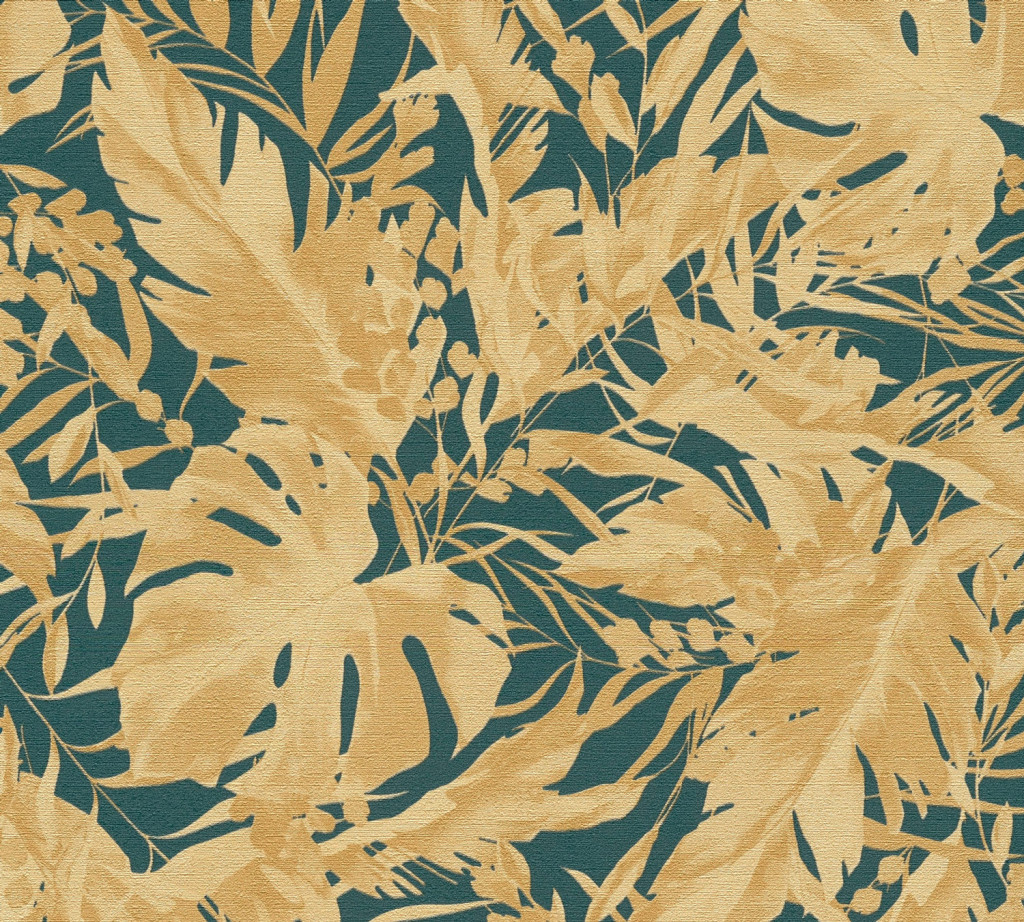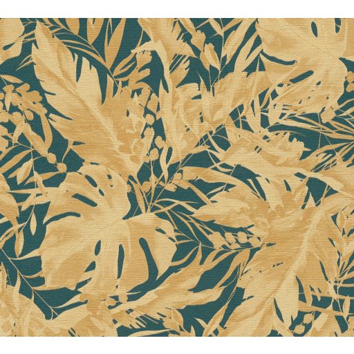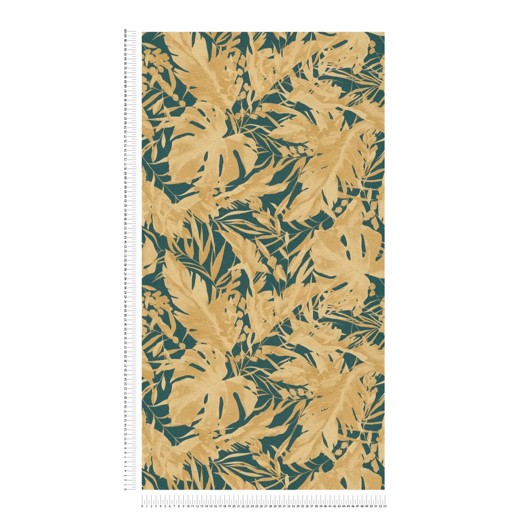 petróleumzöld alapon táncoló, texturált arany trópusi levelek olyanok