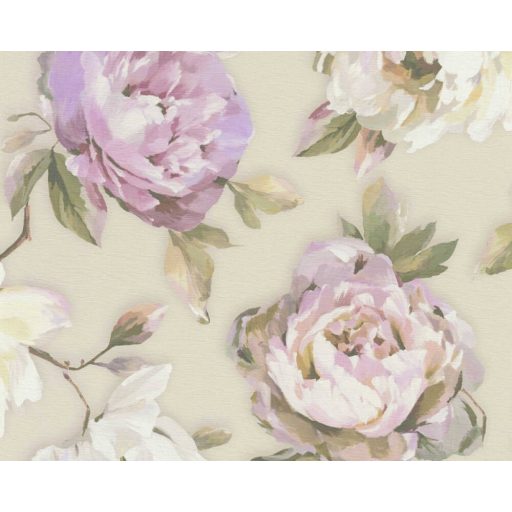Álomszép nagyméretű akvarell virág (rózsa) motívum krém bézs zöld rózsaszín fehér és lila tónus tapéta