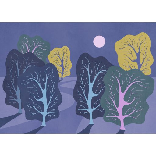 amely egy álomszerű, modern tájképet ábrázol stilizált fákkal és holdfénnyel.