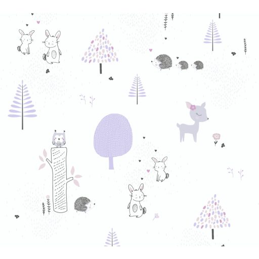 As-Creation Little Love 38117-1 Gyerekszobai Natur erdő nyuszikkal és sünökkel fehér levendula szürke tapéta