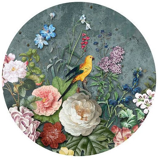 Behang Expresse Floral Utopia INK7595 ABUNDANCE DARK Natur Virágok a bőség kosarából madarakkal betonfal háttéren sötétszürke zöld szines falpanel