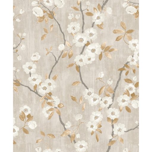 Casadeco Delicacy 85392327 SPRING FLOWER Natur almavirág karcsú leveles ágakon szürkésbézs fehér aranybarna sötétszürke tapéta