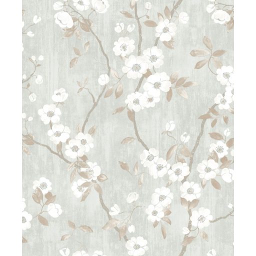 Casadeco Delicacy 85396208 SPRING FLOWER Natur almavirág karcsú leveles ágakon világoskék fehér barna szürkésbarna tapéta
