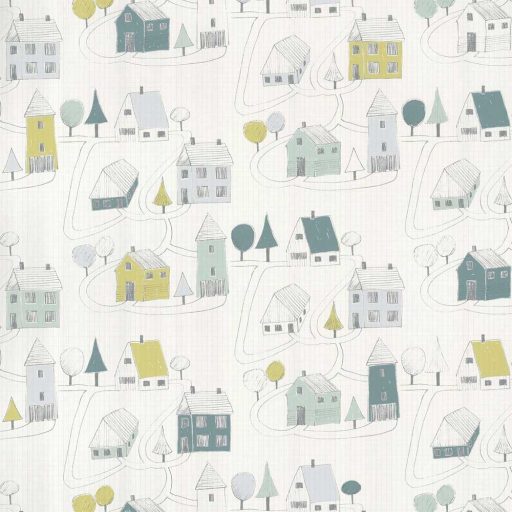 Casadeco Happy Dreams 82847128 SMALL VILLAGE MENTHE VERT falu krémfehér zöld kék menta tapéta