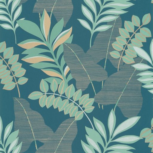 Caselio Escapade 102326618 Voyage Utazás a flóra-fauna világába cserjék levelei kék zöld arany irizáló hatás tapéta
