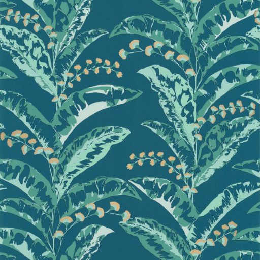 Caselio Escapade 102336733 Epopee Botanikus megejtő szépségű trópusi virágfűzér kék és zöld árnyalatok bézsarany tapéta