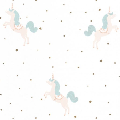 Caselio Girl Power 100796710 Gyerekszobai natur egyszarvúak csillagok fehér bézs türkiz arany csillogó hatás tapéta