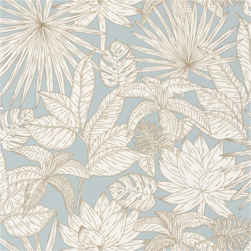 dzsungellevelek művészi ábrázolásban halvány kék krémfehér barna csillogó fémes fény tapéta