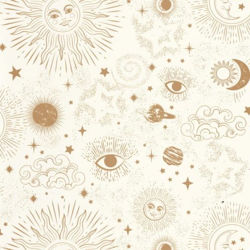 Caselio Young and Free 103240020 AsztroTrend Világűr szimbolikus minta kelta nap hold csillagok szemek fehér aranysárga tapéta