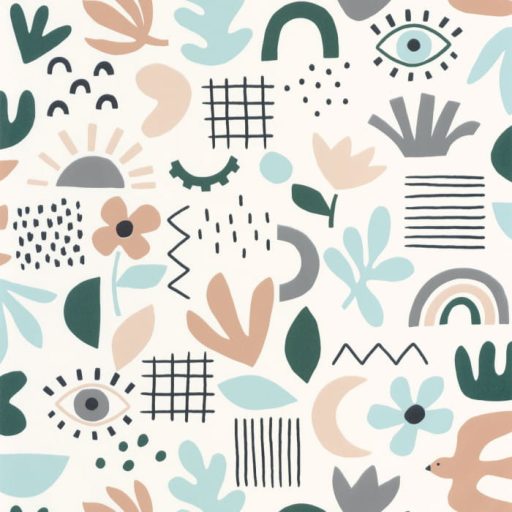 Caselio Young and Free 103286071 FEEL GOOD Művészi naív botanikai minta fehér kékeszöld színes tapéta
