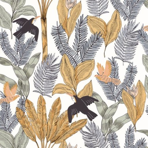 Mintázat : egzotikus trópusi levelek között röpködő tukánok
