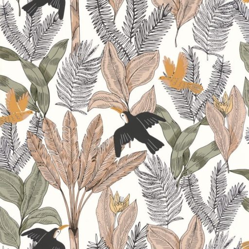 Mintázat : egzotikus trópusi levelek között röpködő tukánok