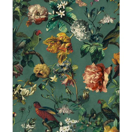 Eijffinger MUSEUM 307305 Vintage műalkotás virágok és madarak páratlanul gazdag megjelenése kékeszöld zöld szines tapéta