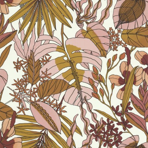 Élő flóra - botanikus minta trópusi indák levelek virágok fehér rózsaszín okkersárga szines tapéta