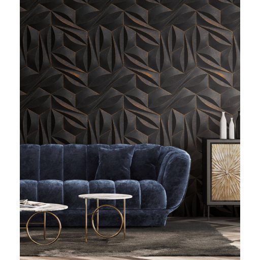 Extrém térbeli hatású absztrakt minta - ismétlődő hatszögek sötétszürke fekete és arany tónus fémes hatás falpanel