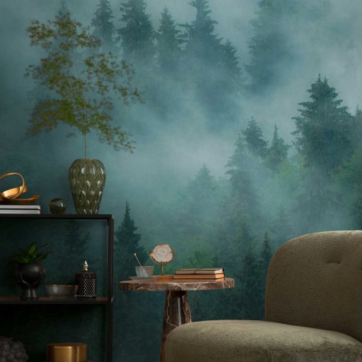 Felhőket rejtő fenyveserdő lélegzetelállító panorámája zöld zöldeskék és törtfehér tónus falpanel