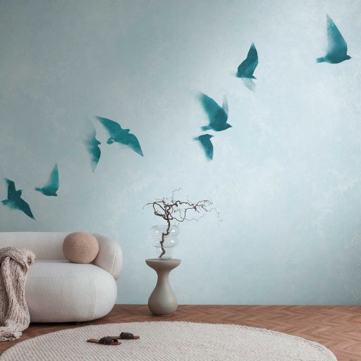 Felröppenő madarak plasztikus akvarell megjelenítése világoskék kék zöldeskék és türkiz tónus falpanel