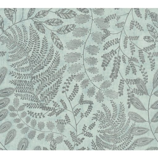 Finom kidolgozású modern levélminta mentazöld/kékeszöld tónus ezüst enyhe mintafény tapéta