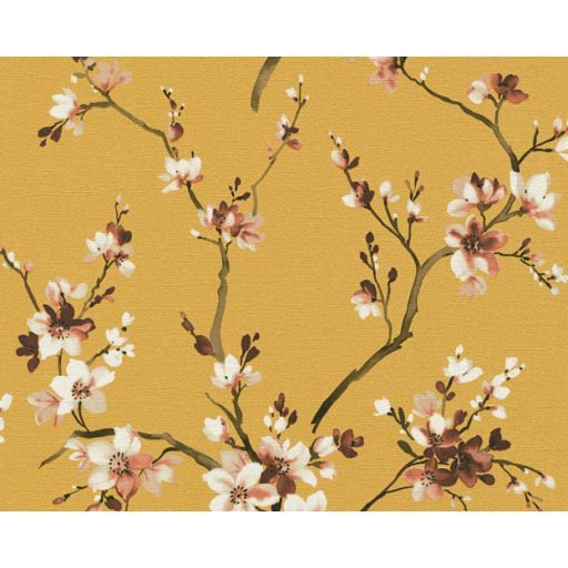 Finom rajzolatú virágzó ágak sárga barna fehér és rózsaszín tónus tapéta