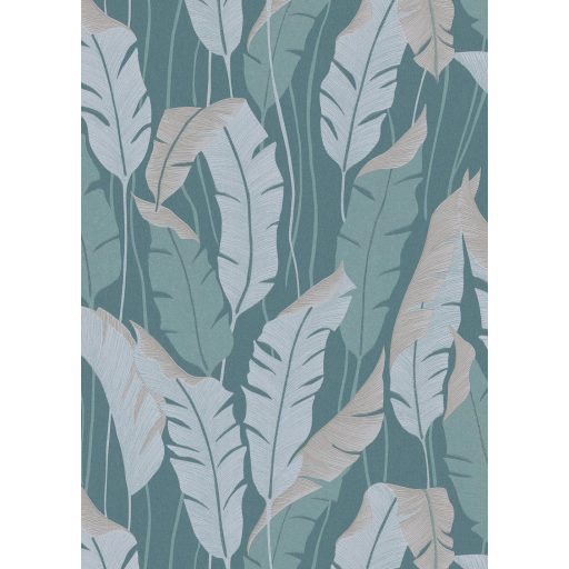 Finoman kidolgozott pálmalevelek kompozíciója türkiz bézs világoskék és zöld tónus fémes hatás tapéta