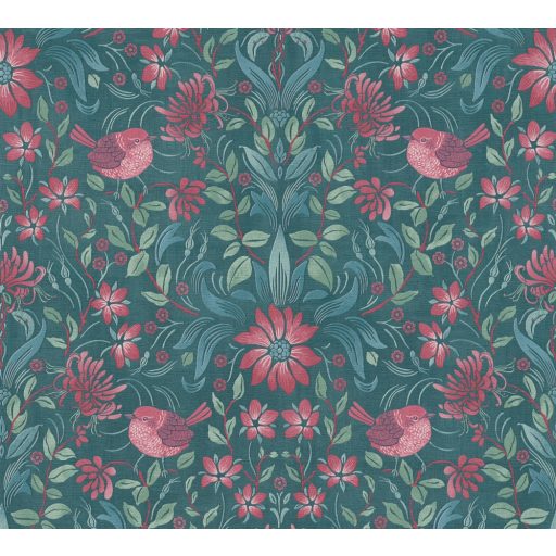 Gazdagon díszített virágos ornamentika kis madarakkal petrol kék zöld és rózsaszín/pink tónus tapéta