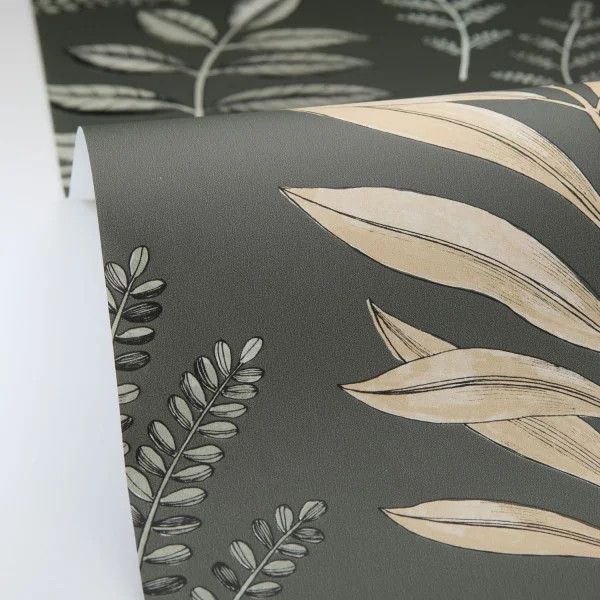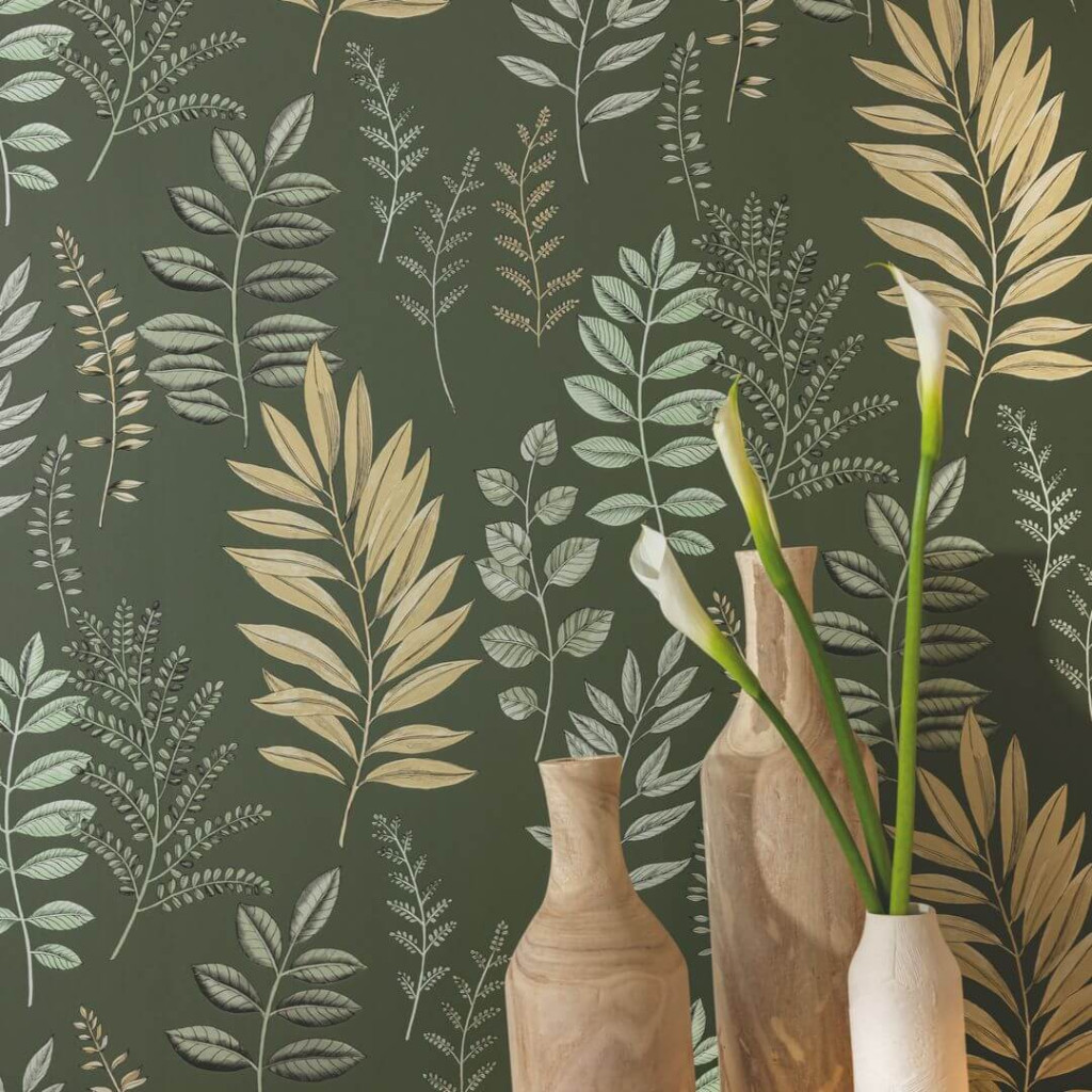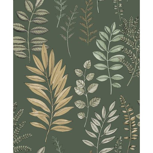 Tipp : A Caselio Herbarium tapéta angolzöld alapon táncoló arany és pasztell levelekkel