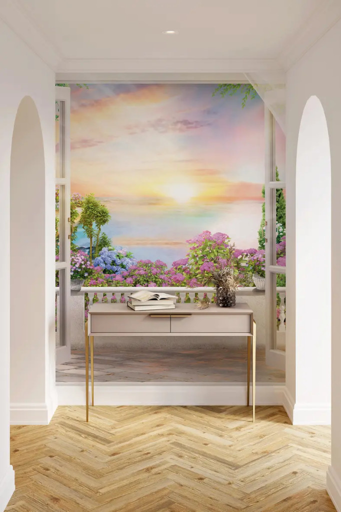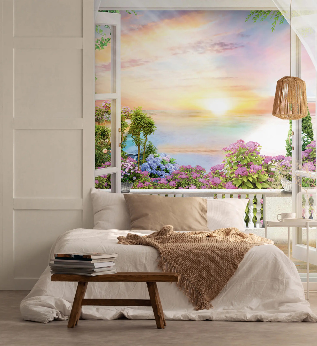 színes virágokkal, tengerparti horizonttal és naplementei égbolttal csábít, mintha
