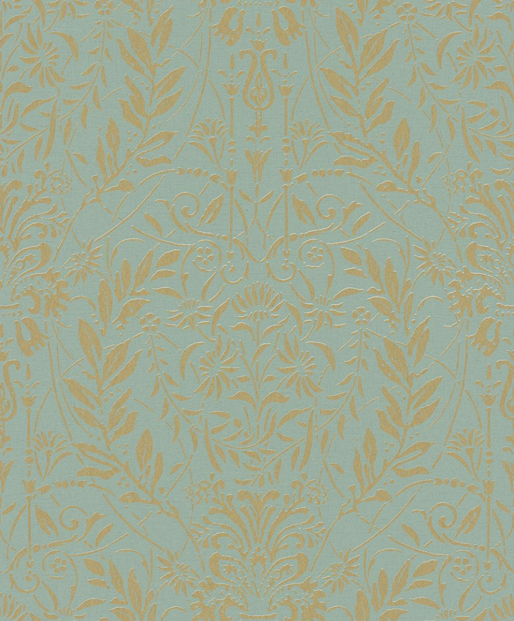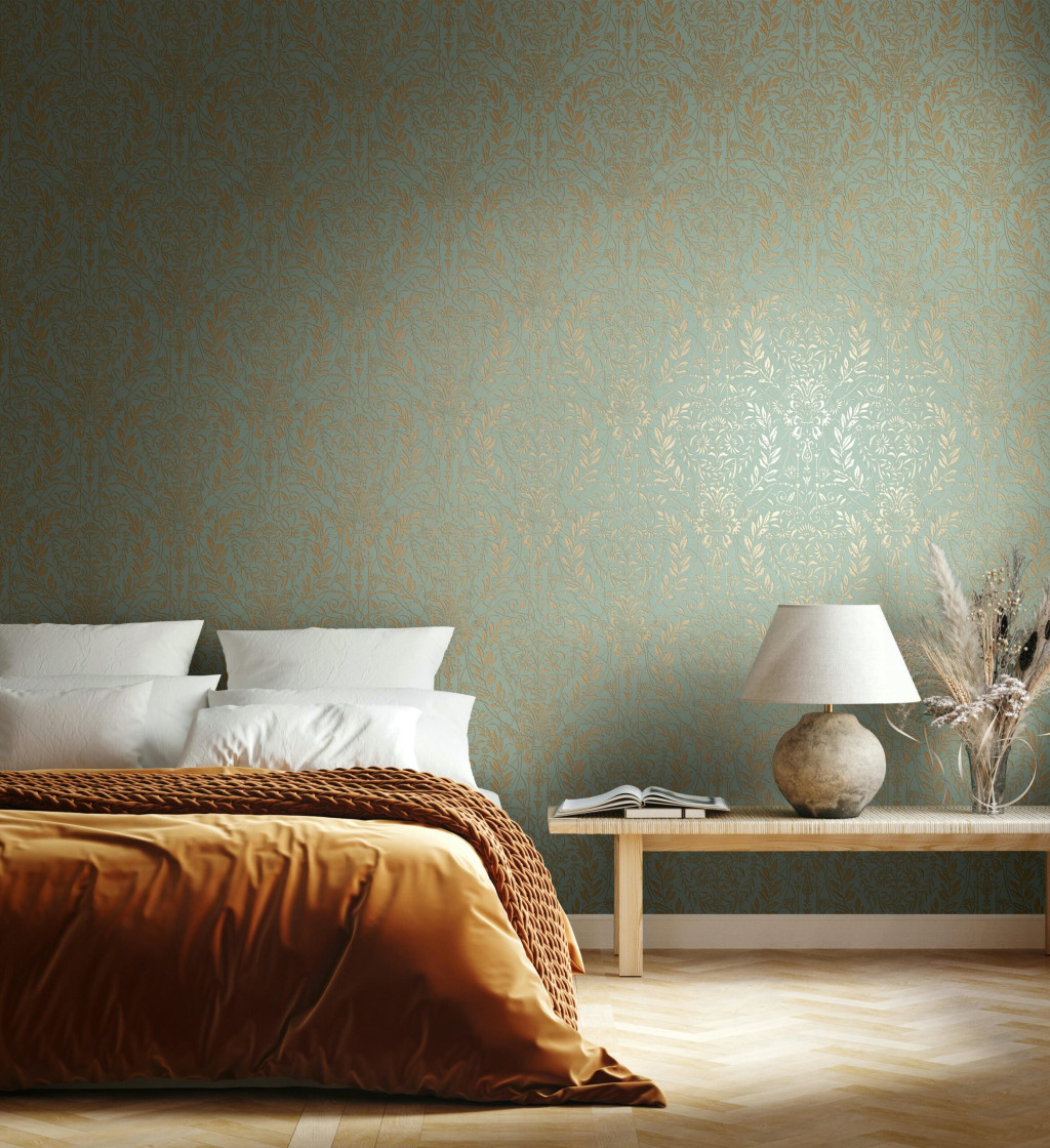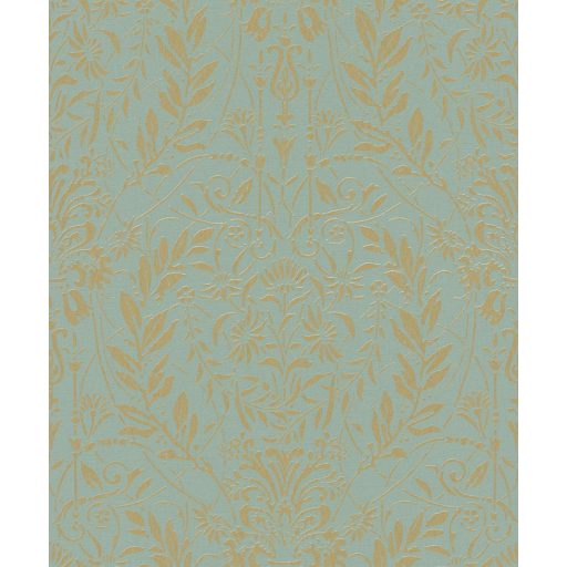 Zsályazöld-kékeszöld alapon meleg matt arany ornamentika hömpölyög
