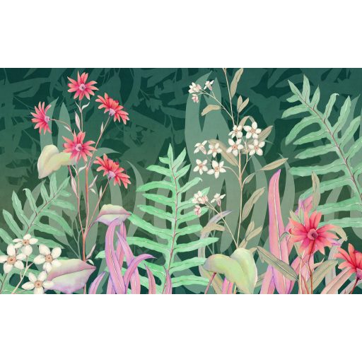 amely egy trópusi kertet idéz lágy akvarell hatású kivitelezésben. A kompozíció