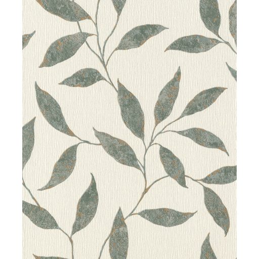 Könnyed szellősen kúszó levelek mintázata törtfehér zöld rézszín fémes kiemelés tapéta