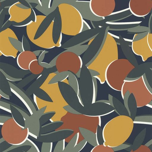 Lutece California Nostalgie 51200601 AGRUMES BLEU et JAUNE Natur Stilizált naív citrusok kék zöld sárga narancs fehér tapéta
