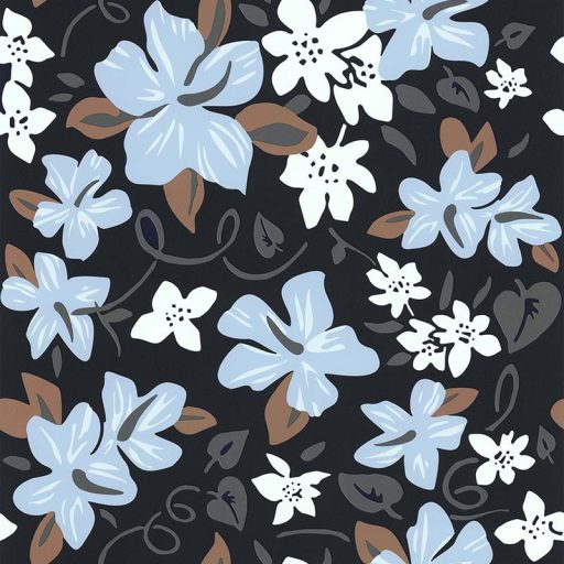 Lutece California Nostalgie 51200701 HAWAI BLEU MARINE Natur Virágos stilizált szirmok antracit világoskék fehér barna khaki finom csillogás tapéta