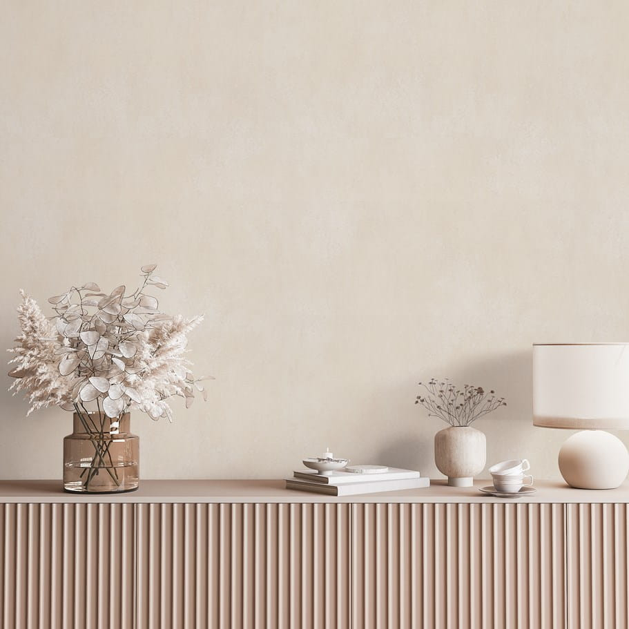 természetes fából készült lamellás bútorokkal és bézs kerámiákkal a japandi stílus