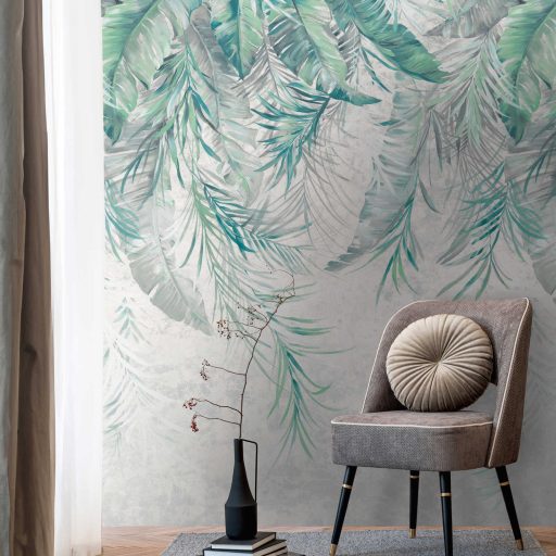 Megejtően szép változatos trópusi levélmintázat fehér szürke zöld és kék tónus falpanel