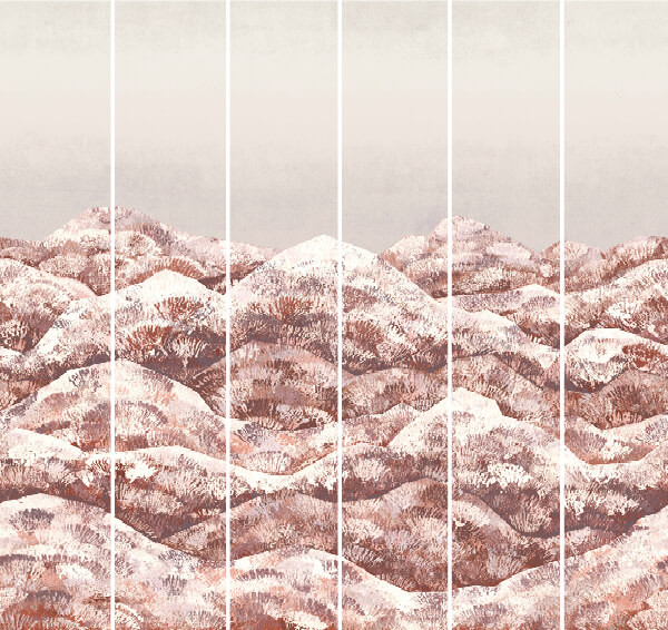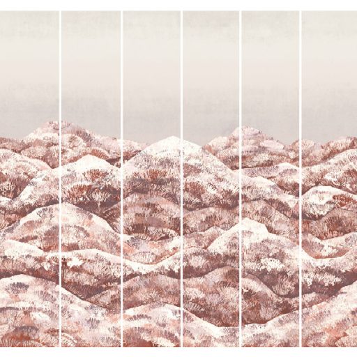 Ez a falfestmény lenyűgöző tájat ábrázol, tele korallvörös, rózsaszín és krémszínű árnyalatokkal