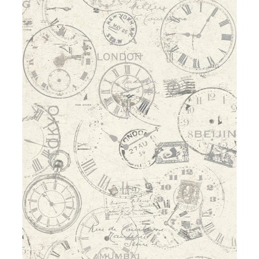 Rasch Andy Wand 649208 Vintage Etno órák bélyegek képeslapok törtfehér szürke lakkfényű ezüst tapéta