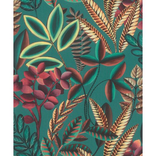 Rasch Florentine III 485547 Botanikus változatos növények levelei textil háttéren vízkék türkizzöld málnapiros kajszibarack vörösesbarna halványsárga tapéta
