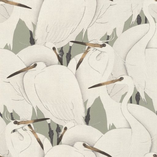 Rasch KIMONO 409543 Natur Darumadár kolónia szövetstruktúra halványzöld alap gyöngyházfehér tollazat barna fekete tapéta