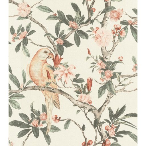 Rasch Poetry II 543315 Natur textil Papagáj virágzó levélágakon törtfehér sötét zsályazöld púderszín barack bézs szürke tapéta