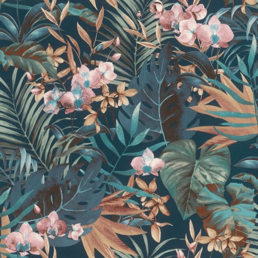 Rasch SALSA 833133 Natur Botanikus egzotikus virágok levelek sötétzöld kék zöld piros barna tapéta