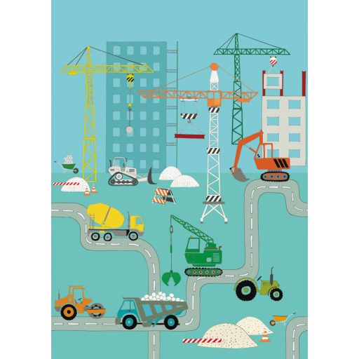 Rasch Studio Onszelf Stories 540772 Gyerekszobai építkezés munkagépek daruk kékeszöld szines falpanel