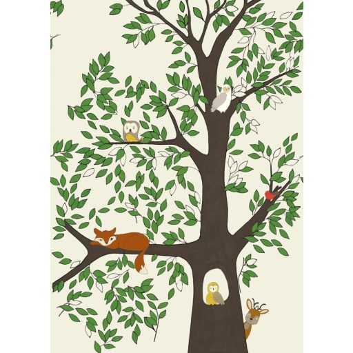 Rasch Studio Onszelf Stories 557756 Gyerekszobai Erdei csendélet rókával bagyollyal és kismadárral krém zöld barna szines falpanel