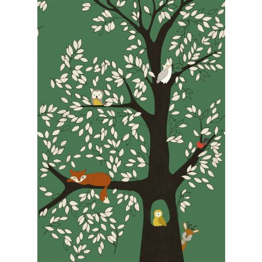 Rasch Studio Onszelf Stories 557763 Gyerekszobai Erdei csendélet rókával bagyollyal és kismadárral zöld barna fehér szines falpanel