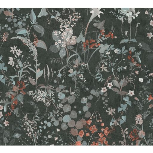 Réti vadvirágok harmonikus kompozíciója fekete zöld kék szürkésbarna és piros tónusok tapéta