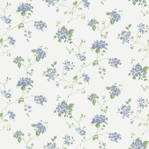 Tipp : A fehér alapon lazán szétszórt kék hortenziabokréták és friss zöld lombozat olyan természetes