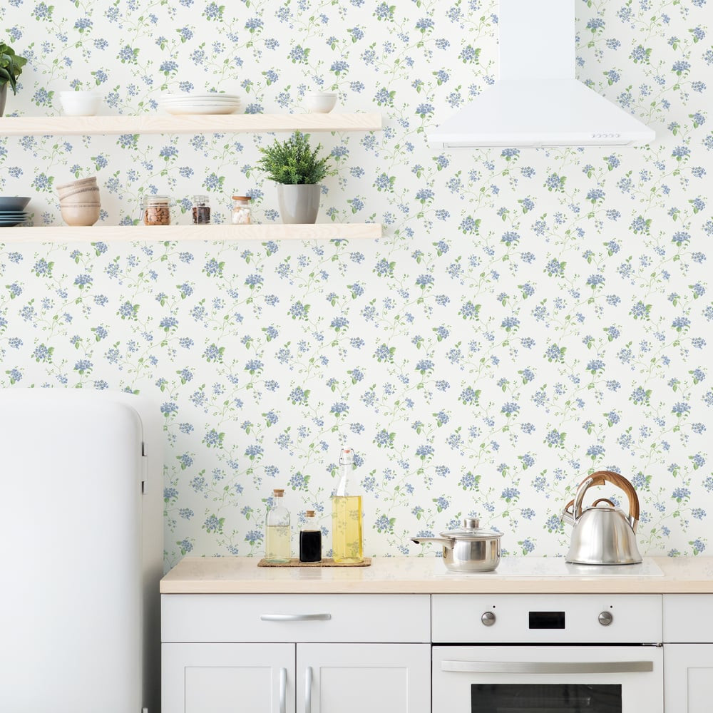 a falakat, mintha egy vintage kertészkönyv lapjairól léptek volna elő a púderkék virágcsokrok.