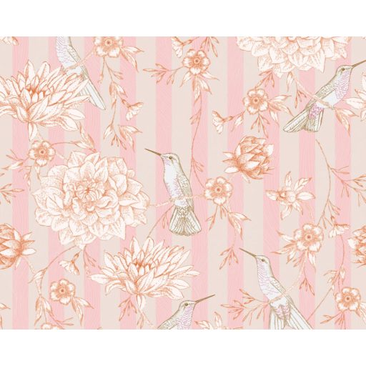 Romantikus és költői virágok madarakkal csíkos háttéren törtfehér rózsaszín és naracs tónus falpanel